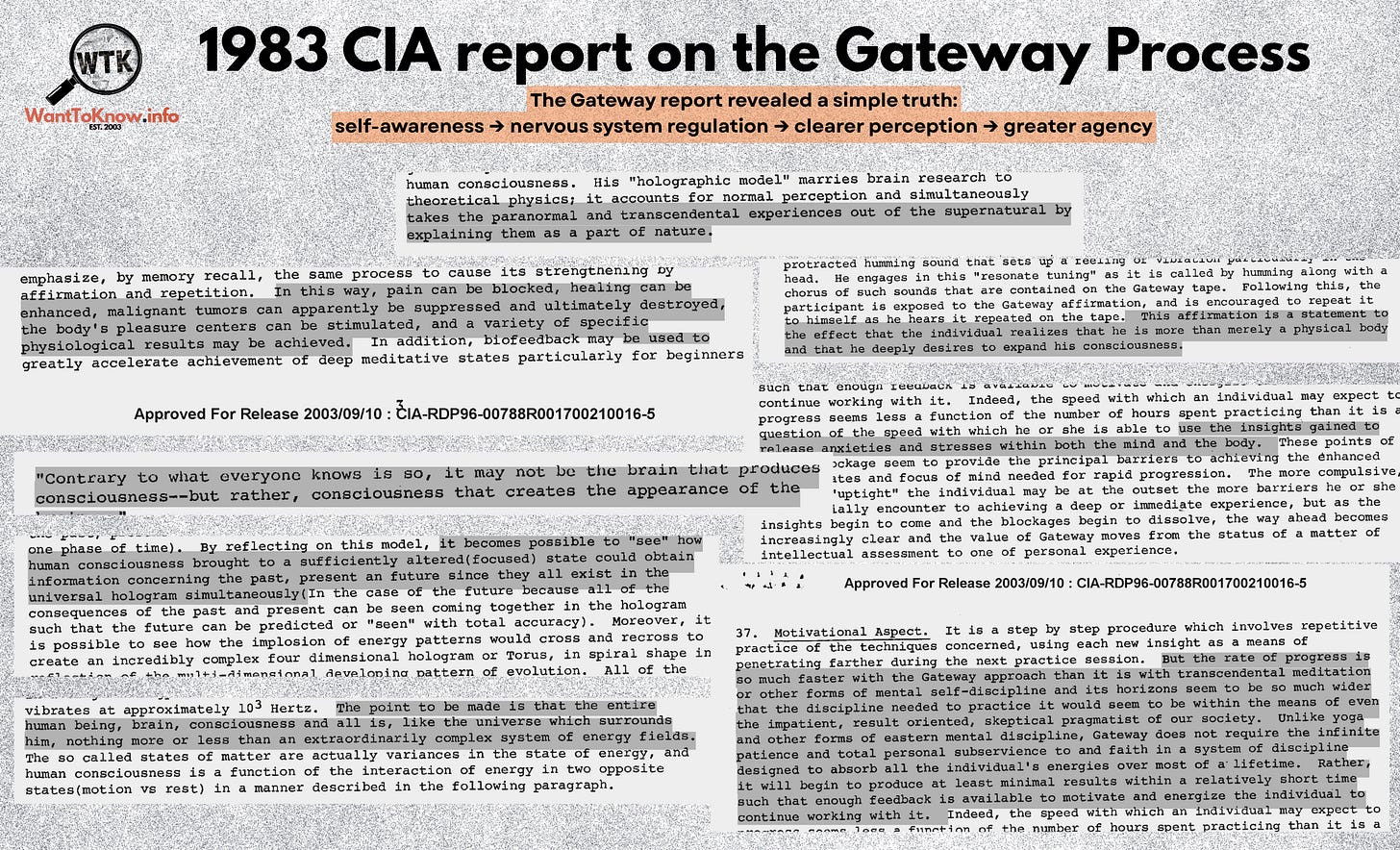The 1983 CIA report on the Gateway Process frames consciousness as a form of energy that transcends the brain. The report also notes rapid results for “ordinary people,” including “impatient, results-oriented, skeptical pragmatists,” outperforming traditional meditation. This was presented not as mystical but neurological, biophysical, and measurable.