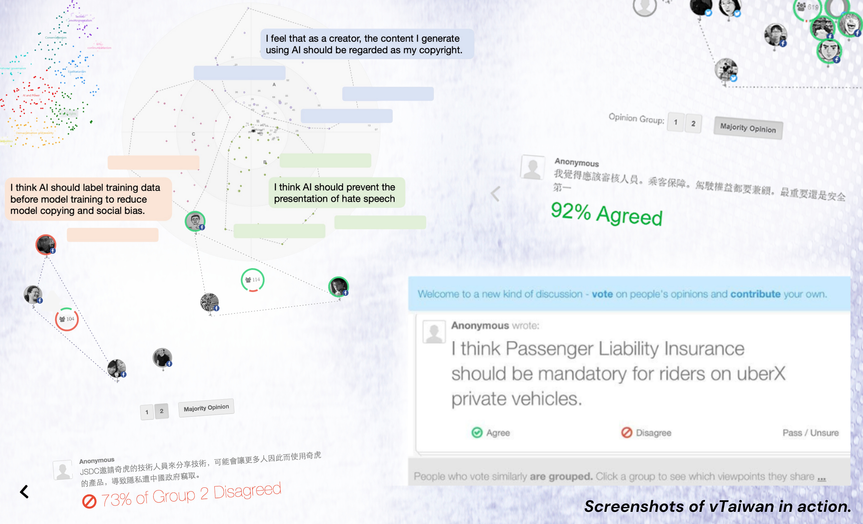 “People compete to bring up the most nuanced statements that can win most people across," [Taiwan's first digital minister Audrey] Tang told me. "They spend far more time discovering their commonalities rather than going down a rabbit hole on a particular issue ... Invariably, within three weeks or four ... we always find a shape where most people agree on most of the statements, most of the time."
